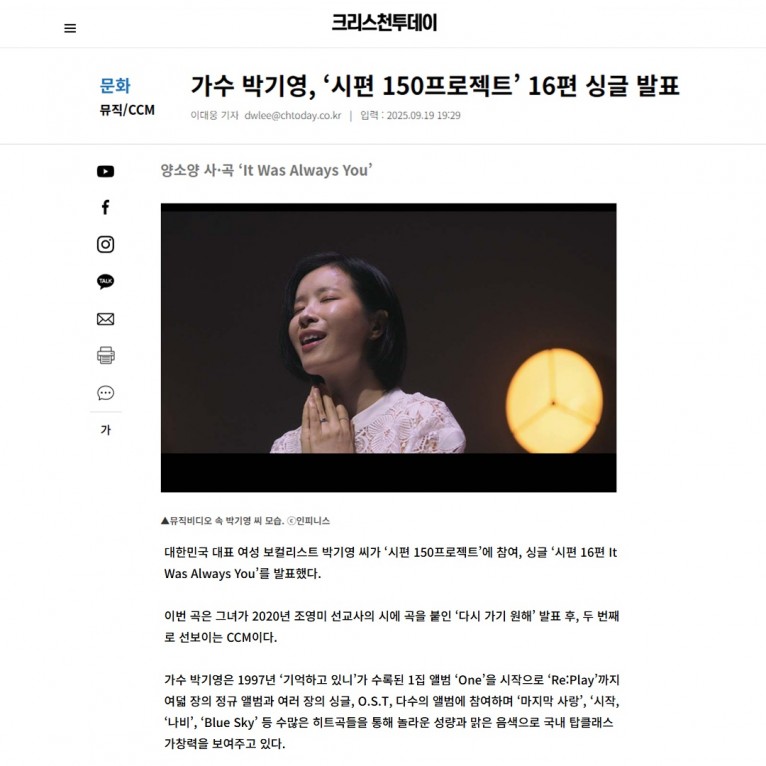 뮤직타임 [기사] 가수 박기영, ‘시편 150프로젝트’ 16편 싱글 발표(크리스천투데이)